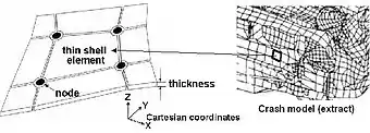 In a typical crash simulation, the car body structure is analyzed using spatial discretization, that is, breaking up the continuous movement of the body in real time into smaller changes in position over small, discrete time steps. The discretization involves subdividing the surface of the constituent, thin, sheet metal parts into a large number (approaching one million in 2006) of quadrilateral or triangular regions, each of which spans the area between "nodes" to which its corners are fixed. Each element has mass, which is distributed as concentrated masses and as mass moments of inertia to its connecting nodes. Each node has 6 kinematic degrees of freedom, that is, one node can move in three linear directions under translation and can rotate about three independent axes. The spatial coordinates (x), displacement (u), velocity (v), and acceleration (a) of each node is mostly expressed in a three-dimensional rectangular Cartesian coordinate system with axes X,Y, and Z.