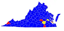 Results of the Democratic primaries. Blue denotes counties/cities won by Creigh Deeds, red denotes counties/cities won by Terry McAuliffe, and yellow denotes counties/cities won by Brian Moran.