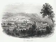 The name Crickhowell is an anglicised spelling that corresponds to the Welsh Crucywel. The name is derived from Crug Hywel, meaning 'Hywel's mound'. This is usually identified with the Iron Age hill fort on nearby Table Mountain, although this has the local name of Mynydd y Begwn. It may be that Crug Hywel refers to the castle mound in the town itself.[3] The language of Crickhowell (and Llangynidr) was originally Welsh. In his 1893 book Wales and her language, John E. Southall, reports that over 60% of the population of Crickhowell spoke Welsh, although the town was only a few miles from more anglicised Abergavenny.[4]