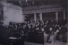 The post-World War II Sabor developed from the National Anti-fascist Council of the People's Liberation of Croatia (ZAVNOH), formed in 1943.[3] In 1945, ZAVNOH transformed itself into the National Sabor of Croatia, preserving the continuity of Croatian sovereignty.[11] After the war, the Communists ran unopposed in the 1945 elections;[12] all opposition parties boycotted the elections due to coercion and intimidation by the OZNA secret police and the Communist Party, aimed at eliminating electoral dissent.[13] Once in power, the Communists introduced a single-party political system, with the Communist Party of Yugoslavia (from 1952 the League of Communists of Yugoslavia) as the ruling party and the Communist Party of Croatia (from 1952 the League of Communists of Croatia) as a branch party.[14] In January 1990, the Communist Party fragmented along national lines, with the Croatian faction demanding a looser federation.[15]