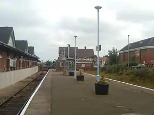To cater to the heavy leisure traffic at the end of the 19th century, Cromer Beach had a large station building in a half-timbered style, and a large goods yard. The station originally included a bar, which was closed in 1966.[1] Following the introduction of conductor-guard working, the ticket facilities were no longer needed and the building fell into disuse; it was renovated and reopened as a public house in 1998.[2] A large supermarket was built on the site of the goods yards in 1991.[3]