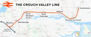 The Crouch Valley line (sometimes referred to as the Southminster branch line)[1] is a branch line off the Shenfield–Southend line in Essex, in the east of England. It links Wickford in the west to Southminster in the east. During peak hours, trains connect to or from the Great Eastern Main Line at Shenfield, and its London terminus at Liverpool Street.