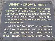 A 6-foot 6-inch high statue of Jimmy Crow was unveiled in the Centenary Park at Crows Nest on 12 July 1969 by Minister for Labour and Tourism, John Herbert. The statue was sculpted by Fred Gardiner of the Tia Art Gallery. The statue was cut from a single block of Helidon freestone and weighs over one ton. An 18-foot high hollow tree stump was also moved to Centenary Park and a fig tree was planted on top so the roots could be trained around it to form a living hollow tree. It is believed to be the only memorial in Australia to an Aboriginal person after whom a town was named.[5][6]