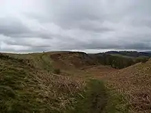 On Croy Hill, to the north east of the village, are remnants of the Antonine Wall, built by the Romans between AD 142 and 144, including a fort and two beacon platforms. Inscribed stones indicate that construction was undertaken by the Sixth Legion Victrix .[4] Croy hill's neighbouring forts were Barr Hill to the west and Westerwood to the east. Two communication platforms known as ‘expansions’ can be seen to the west of the fortlet.[5] Alexander Park excavated the site in 1890–1891.[6] Sir George Macdonald wrote about his excavation of the site which occurred in 1920, 1931, and 1935.[7] At Croy Hill, the ditch in front of the rampart was not excavated by the Romans. It is likely that hard basalt and dolerite of the hill was virtually impossible to shape with Roman tools. This is the only place along the Wall where the ditch was not dug.[8] There is a bath house just outside one fort.[9]