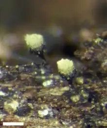 In particular, the species C. blascoi is defined as a lichen measuring 0.15–0.36 mm in height without mazaedium, with a peridium spherical or urniform in shape measuring 0.05–0.10 × 0.10–0.15 mm that appears dark violet when wet but black and shiny when dehydrated, with an ocre disk around the peridium, and a stalk measuring 0.10–0.26 × 0.02–0.04 mm that is smooth, black and shiny, sometimes with a broader base.[1]