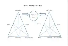In his 1987 "Learning by expanding", Engeström[45] offers a very detailed account of the diverse sources, philosophical and psychological, that inform activity theory. In subsequent years, however, a simplified picture has emerged from his and other researchers' work, namely the idea that (to date) there are three principal 'stages' or 'generations'[46] of activity theory, or "cultural-historical activity theory (CHAT).[47][48][49][50][51] Whilst the first generation built on Vygotsky's notion of mediated action, from the individual's perspective, and the second generation built on Leont'ev's notion of activity system, with emphasis on the collective,[52] the third generation, which appeared in the mid-nineties, builds on the idea of multiple interacting activity systems focused on a partially shared object, and boundary-crossings between them.[47][53][54]