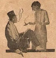 Aside from film adaptations of Gilbert and Sullivan operas, several films have treated the G&S partnership.[160] Mike Leigh's film Topsy-Turvy (1999) is a film depiction of the team and the creation of their best known opera, The Mikado. Another G&S film is the 1953 The Story of Gilbert and Sullivan (or The Great Gilbert and Sullivan in the U.S.), starring Robert Morley as Gilbert and Maurice Evans as Sullivan, with Martyn Green as George Grossmith. In a short 1950 film called The Return of Gilbert and Sullivan, Gilbert and Sullivan return to Earth to protest the jazz treatment of their work.[161] In the 1951 film The Magic Box Sir Arthur Sullivan, played by the film conductor Muir Mathieson, conducts a choral concert of the Bath Choral Society.[162]