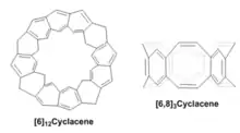 Cyclacenes are synthesized usually via interactive reactions to construct the repetitive units in the ring structure. Stoddart and co-workers synthesized [6]12cyclacene through interactive Diels-Alder reactions.[1][2] Reacting 7-oxoanorbornene derivative A with bisdienophile B generated intermediate C in good yield (Fig. 2). Compound C further reacted with A under high pressure to close the ring structure and afforded compound D with 12 consecutive six-membered rings fused together. To convert compound D to [6]12cyclacene, Stoddart and co-workers used a two-step process where the 6 ether linkages in D were removed and additional double bonds were generated to afford the π-systems in the final product.