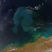 A large algal bloom off the coast of Pilbara in March following Cyclone Rusty. Sediment run-off from heavy rains can also be seen along the coast.