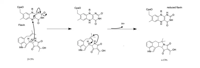 Three enzymes are utilized in the biosynthesis of α-CPA: the polypeptide CpaS, dimethylallyltransferase (CpaD), and flavoprotein oxidocyclase (CpaO).[3] CpaS is the first enzyme in the biosynthetic pathway and is a hybrid polyketide synthase- nonribosomal peptide synthetase (PKS-NRPS). It uses the precursors acetyl-CoA, malonyl-CoA, and tryptophan to produce cyclo-acetoaceytl-L-tryptophan (cAATrp).[3] The intermediate cAATrp is then prenylated with dimethylallyl pyrophosphate (DMAPP) by the enzyme CpaD to form the intermediate β-CPA. CpaD has high substrate specificity and will not catalyze prenylation in the presence of DMAPP's isomer isopentyl pyrophosphate (IPP) or the derivatives of cAATrp.[2] The third enzyme, CpaO, then acts on β-CPA through a redox mechanism that allows for intramolecular cyclization to form α-CPA.[3]