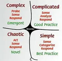 1. 1 2 Snowden and Boone (2007): "The framework sorts the issues facing leaders into five contexts defined by the nature of the relationship between cause and effect. Four of these—simple, complicated, complex, and chaotic—require leaders to diagnose situations and to act in contextually appropriate ways. The fifth—disorder—applies when it is unclear which of the other four contexts is predominant."[2]