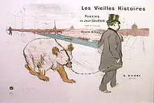 For the cover of the Vieilles Histoires, subtitled "répertoire mondain", a collection of poems by Jean Goudezki set in music by Désiré Dihau and published by Ondet in 1893, Lautrec drew a lithograph representing the musician, his bassoon under his arm, pulling the bear Goudezki by the leash to lead him to the Institut de France via the pont des Arts.[6] The plate titled Pour toi!, in the same collection, is a portrait of Désiré Dihau inspired by L'Orchestre de l'Opéra by Edgar Degas which Lautrec much admired.[7] Another lithograph by Lautrec depicts Dihau in Anna Judic's lodge in 1894 while her corset is being laced. The lithograph is kept at the Albright–Knox Art Gallery in Buffalo.[8] A drawing of 1896 depicts him in a bust of profile.[6][9]