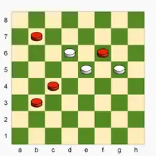 The oblique hit combines the rules regarding linear movement and maximum capture. In the diagram, White wins by moving c3 to e5 (bottom left white man to the square just to the right of bottom right black man). Black has two captures available, d5 to f5, capturing the man White just moved, and c5 to e3, capturing the man on c4 and then immediately after the one on d3. Maximum capture takes precedence, however, so Black must capture the two men on c4 and d3. This leaves White open to capture the black men on d5 and c6 landing one square away from the king's row (c7). If Black moves his man closest to the king's row he will not be able to reach it before White or stop White's other man from reaching the other king's row first.[3]