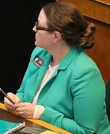 Esgar previously served as the House Majority Caucus Chair. She was also the chair of the Capital Development Committee, the vice chair of the House Health, Insurance, & Environment Committee, and a member of the House Agriculture, Livestock, and Natural Resources Committee and the House Transportation & Energy Committee.[4] Additionally, she served as temporary Speaker of the House during the January 9th, 2023 Speaker election for the 74th General Assembly, making her the first openly gay representative to hold the Speaker's gavel in the state.[5]