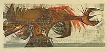 In 1953, he moved to Kent, WA and began teaching at various Seattle institutions, including Broadway High School, Seattle University, Cornish College of the Arts, Burnley School of Professional Art (now the Seattle Art Institute), and the Seattle Art Museum. In 1959, he became a Carnegie fellow at the University of Alaska.[6] His year as Carnegie artist-in-residence involved traveling around the state, teaching classes and workshops along the way. The following year he founded the University of Alaska’s art department and created the first academic art curriculum in the State. Among the students he taught in Alaska were Bernard Katexac, Dale De Armond, and Joseph Senugetuk.[8][9] While in Alaska, he served as an advisor to the Bureau of Indian Affairs. The landmark report that he and economist George Rogers wrote in 1962 for the BIA, after the two of them traveled together through Canada, recommended self-determination and that non-commercial, academic institutions in Alaska host the production of Alaska Native art.[8] He was instrumental in hiring Ronald Senungetuk, who subsequently founded the university's Native Arts Center, to teach in the department.