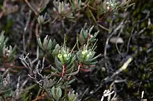 Darwinia glaucophylla is a prostrate shrub but with erect side branches which reach to a height of 15 cm (6 in). The leaves are arranged in opposite pairs and are bluish green with a reddish tinge, glabrous, 8–17 mm (0.3–0.7 in) long and triangular in cross section. The flowers are arranged mostly in groups of between two and four, the groups on a stalk about 1 mm (0.04 in) long. There are leaf-like bracts 8–12 mm (0.3–0.5 in) long and reddish brown bracteoles at the base of the groups but which fall off as the flowers develop. The floral cup is 7–8 mm (0.28–0.31 in) long, about 1 mm (0.04 in) wide and has distinct ribs. The sepals are 0.5 mm (0.02 in) or less long and much shorter than the petals. The style is straight, white and 12–16 mm (0.5–0.6 in) long. Flowering occurs from July to November and is followed by fruit which is a tiny capsule containing a single seed 1.5 mm (0.06 in) in diameter.[2][3][4][5]