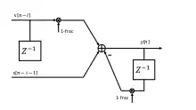 When going back in the time domain exploiting the inverse Z-transform, this corrsponds to , where is the Dirac delta. The former equation holds for but for the implementation we need a fractional delay, meaning . In this case, interpolation is required to reconstruct the value of the signal that lies between two samples.[4] One can resort to the preferred interpolation technique, e.g., Lagrange interpolation,[5] or all-pass interpolation.[6]