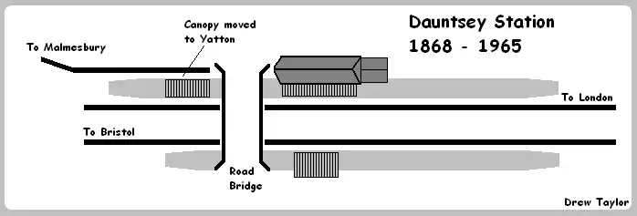 Dauntsey station became the junction for the branch line to Malmesbury in 1877. The up platform was extended west of the road bridge with a bay platform to accommodate trains on the branch line. When the GWR built the South Wales Main Line in 1903 it passed a few miles north of Dauntsey. In 1933 the connection between the Malmesbury branch and the main line was moved to Little Somerford on the newer main line, and the redundant section between Dauntsey and Somerford became a siding. The canopy used for the branch line platform was moved to Yatton station where it can still be seen today.