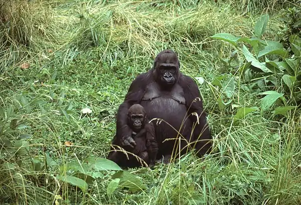 Gorilla ’Nina’ with baby 'Wanto' in the new exhibition habitat. Photo by David Hancocks.