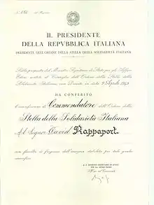 In 1969, he was awarded the Order of the Star of Italian Solidarity with the title Commendatore for strengthening commercial relations between the United States and Italy.[6]