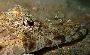 De Beaufort's flathead is a medium-sized fish which grows up to 50 cm (19.7 in), but the average size mostly observed is 35 cm (13.8 in).[2] The body is elongated and the head is particular because of its flat appearance like a duck bill. They have lappets at the rear of their globulous eyes, which help to break up the outline of the black iris and improve their camouflage. Juveniles begin black with few white spots and a white line behind the head. The adults have a body coloration which can vary in intensity according to the surrounding. The body is covered with a pattern like a mosaic of beige to brown spots or even greenish to grey separated by an interlacing of blue lines which ideally camouflages them with their habitat.[5]