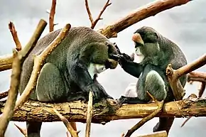 A female De Brazza's monkey grooms a male.
