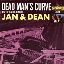 "Dead Man's Curve" is a 1964 hit song by Jan and Dean whose lyrics detail a teen street race gone awry. It reached number eight on the Billboard Hot 100 singles chart and number 39 in Canada.[3] The song was written and composed by Brian Wilson, Artie Kornfeld, Roger Christian, and Jan Berry at Wilson's mother's house in Santa Monica. It was part of the teenage tragedy song phenomenon of that period, and one of the most popular such selections of all time. "Dead Man's Curve" was added to the Grammy Hall of Fame in 2008.[4]
