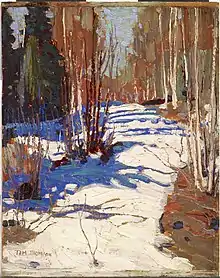In 2002, the National Gallery of Canada staged a major exhibition of his work, giving Thomson the same level of prominence afforded Picasso, Renoir, and the Group of Seven in previous years.[60] As of 2009, the highest price achieved by a Thomson sketch was Early Spring, Canoe Lake (1917) which sold in 2009 for $2,749,500 (equivalent to C$3,403,000 in 2021). Few major canvases remain in private collections, making the record unlikely to be broken.[61] One example of the demand Thomson's work has achieved is the previously lost Sketch for Lake in Algonquin Park (1912/13). The painting was discovered in an Edmonton basement in 2018 and went on to sell for nearly half a million dollars at a Toronto auction.[62][63] The increased value of Thomson's work has led to the discovery of numerous forgeries of his work on the market.[64][65][66]