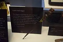Kanaʻina angrily approached Cook, who reacted by striking the chief with the broad (flat) side of his sword. Kanaʻina jumped at Cook and grabbed him. Some accounts state that Kanaʻina did not intend to hit Cook while other descriptions say the chief deliberately struck the navigator across the head with his leiomano.[28] Either way, Kanaʻina pushed Cook, who fell to the sand. As Cook attempted to get up, Nuaa lunged at him and fatally stabbed him in the chest with a metal dagger, obtained by trade from Cook's ship during the same visit. Cook fell with his face in the water.[10] This caused a violent, close-quarters melee between the Hawaiians and Cook's men.[29]