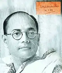 Subhas Chandra Bose's exploits had become legendary long before his physical death in August 1945.[30][lower-alpha 8] From the time he had escaped house arrest in Calcutta in 1940, rumours had been rife in India about whether or not he was alive, and if the latter, where he was and what he was doing.[30] His appearance in faraway Germany in 1941 created a sense of mystery about his activities. With Congress leaders in jail in the wake of the Quit India Resolution in August 1942 and the Indian public starved for political news, Bose's radio broadcasts from Berlin charting radical plans for India's liberation during a time when the star of Germany was still rising and that of Britain was at its lowest, made him an object of adulation among many in India and southeast Asia.[31] During his two years in Germany, according to historian Romain Hayes, "If Bose gradually obtained respect in Berlin, in Tokyo he earned fervent admiration and was seen very much as an 'Indian samurai'."[32] Thus it was that when Bose appeared in Southeast Asia in July 1943, brought mysteriously on German and Japanese submarines, he was already a figure of mythical size and reach.[31]