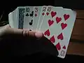 Like Accordion, Decade is traditionally played with the cards in a line, but due its minimal use of space can also be played in one hand. This is done by placing the deck face-down in the hand, and placing the line in a stack on top of the deck, with the discard pile face up on the bottom (as seen in the images below).