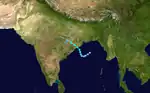 On June 28, an area of disturbed weather in the Bay of Bengal that had persisted as a well-marked low pressure area for two days became more organised.[42] The India Meteorological Department (IMD) noted the formation of a depression around 0000 UTC (5:30 am IST) southeast of Puri, Orissa, India. The IMD also stated that the system intensified into a deep depression three hours later whilst remaining "practically stationary".[43] The Joint Typhoon Warning Center (JTWC) issued a Tropical Cyclone Formation Alert shortly after, noting that observations from the eastern coast of India had recorded falls in pressure corresponding with the system's development. Furthermore, an upper-level anticyclone had formed over the disturbance, which would maintain the favourable wind shear conditions.[44] The JTWC initiated advisories later that day,[45] as the depression moved northwest towards the Orissa coast.[46] The depression made landfall near Puri early on June 29.[47] The JTWC then issued its last advisory later that day, as the system moved inland.[48] Early on June 30, with the system centred over Madhya Pradesh and Chhattisgarh, the IMD downgraded the system to a depression,[49] and discontinued advisories 6 hours later.[49]