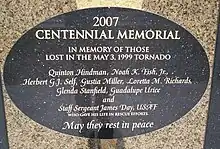 A memorial stands along a walking and bike path on Sooner Road and is dedicated to the seven people who lost their lives during the May 3 tornado.[31] United States Air Force Staff Sergeant James Day was killed in an ATV accident on May 8, 1999, while he was patrolling an area of Tinker AFB, Oklahoma, which had been damaged in the tornado. He is also listed on the memorial.[32]