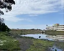 The lagoon had a tidal exit channel as recently as 1929, before the Venice Oil Field was discovered and the Ballona Creek delta was reworked, by the 1930s flood-control channelization as well as the 1960s creation of Marina Del Rey.[10]