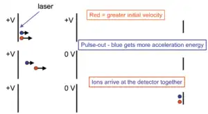 With delayed extraction, the mass resolution is improved due to the correlation between velocity and position of the ions after those have been produced in the ion source. Ions produced with greater kinetic energy have a higher velocity and during the delay time move closer to the extraction electrode before the accelerating voltage is applied across the target or pulsed electrode. The slower ions with less kinetic energy stay closer to a surface of the target electrode or pulsed electrode when the accelerating voltage is applied and therefore start being accelerated at a greater potential compared to the ions farther from the target electrode. With the proper delay time, the slower ions will receive enough extra potential energy to catch the faster ions after flying some distance from the pulsed acceleration system. Ions of the same mass-to-charge ratio will then drift through the flight tube to the detector in the same time.