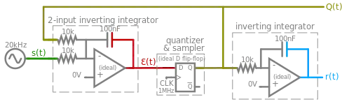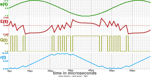 The Greek letter epsilon is used because Ɛ(t) contains the accumulated error that is repeatedly corrected by the feedback mechanism. While both its inputs s(t) and Q(t) vary between -1 and 1 volts, Ɛ(t) instead only varies by a couple millivolts about 0 V.