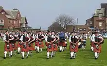 When in Grade 3A, the band took first place in the 2006 World Pipe Band Championships[5] at Glasgow Green, and won the annual Champion of Champions for 3A.[6] This resulted in promotion to Grade 2 for 2007. Since then, the band placed 2nd at the 2011 World Championships, winning the prize for best drum corps.[7] In 2012, success continued, with 2nd places at both the Scottish and British Championships, and 1st places at the European, Cowal and World Championships taking champion of champions title 2012 and securing promotion to Grade 1. In 2012, the drum corps placed 1st at the Scottish, British and European Championships.[8] In 2017 the “wee band “ then grade 4A band achieved top 6 places in 4 out of 5 major championships including becoming British Champions and 4th at the World Championships which secured promotion to Grade 3B for the 2018 season.