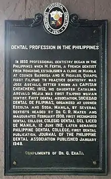 - ↑ Dental Profession in the Philippines historical marker by the National Historical Institute, installed 1961