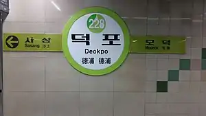 Deokpo Station (Korean: 덕포역; Hanja: 德浦驛) is a station on the Busan Metro Line 2 in Deokpo-dong, Sasang District, Busan, South Korea.