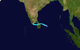 A near-equatorial trough spawned a low-pressure area on December 22 in the central Bay of Bengal. A circulation within the system developed into a depression on December 23 about 500 km (310 mi) east-southeast of Sri Lanka.[4] A low-latitude storm, the system organized while moving slowly westward.[15] On December 24, the depression strengthened into a deep depression, and the following day into a cyclonic storm,[4] the same day that the JTWC classified it as Tropical Cyclone 04B.[15] An eye developed in the center of the blossoming convection, and the system rapidly intensified into a very severe cyclonic storm on December 26. According to the IMD, the cyclone attained peak winds of 165 km/h (105 mph), and made landfall at that intensity along eastern Sri Lanka near Trincomalee around 12:00 UTC on December 26.[4] The JTWC assessed lower winds of 120 km/h (75 mph).[15] Weakening quickly over land, the storm emerged into the Gulf of Mannar on December 27 and failed to restrengthen. Later that day, it made a second landfall in extreme southern India near Thoothukudi as a cyclonic storm. Continuing westward, the system emerged into the Arabian Sea on December 28 as a depression and degenerated into a remnant low. On the next day, the remnant low merged with a trough and spread rainfall northward through India.[4]