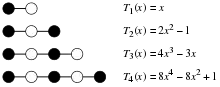 An important family of examples of Shabat polynomials are given by the Chebyshev polynomials of the first kind, , which have −1 and 1 as critical values. The corresponding dessins take the form of path graphs, alternating between black and white vertices, with edges in the path. Due to the connection between Shabat polynomials and Chebyshev polynomials, Shabat polynomials themselves are sometimes called generalized Chebyshev polynomials.[9][10]