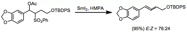 - ↑ Ihara, M.; Suzuki, S.; Taniguchi, T.; Tokunaga, Y.; Fukumoto, K. (1994). "Modification of the Julia Alkenation Using SmI2-HMPA". Synlett. 1994 (10): 859. doi:10.1055/s-1994-23033.