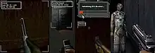 Deus Ex features combat similar to first-person shooters, with real-time action, a first-person perspective, and reflex-based gameplay.[3] As the player will often encounter enemies in groups, combat often tends toward a tactical approach, including the use of cover, strafing, and "hit-and-run". A USA Today reviewer found, "At the easiest difficulty setting, your character is puréed again and again by an onslaught of human and robotic terrorists until you learn the value of stealth."[8] However, through the game's role-playing systems, it is possible to develop a character's skills and augmentations to create a tank-like combat specialist with the ability to deal and absorb large amounts of damage. Non-player characters will praise or criticize the main character depending on the use of force, incorporating a moral element into the gameplay.[9]