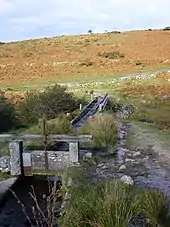 The Devonport Leat begins a short distance to the north of Wistman's Wood[3] at an altitude of over 410 metres (1,350 ft) and twice passes close to Two Bridges[4] (following the contours up the Cowsic valley in between) before heading towards Princetown.[5] Its water supply now ends up in Burrator Reservoir.[6] It follows a meandering path across the moor, carefully selected by engineers to follow the natural contours of the land.[7]