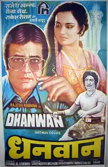 Dhanwan is a 1981 Hindi film starring Rajesh Khanna in the lead role, paired opposite Reena Roy and produced by Sohanlal Kanwar.[1] The supporting cast includes Aruna Irani, Rakesh Roshan, Shakti Kapoor, Om Prakash and Vijayendra Ghatge. Rakesh Roshan was nominated for the Best Supporting Actor at the Filmfare Awards, the only one for the film. Reena Roy plays the role of a defiant widow who reforms the egotistical Rajesh Khanna in the film. The movie was a super hit grossing over 13.9 crores in 1981.