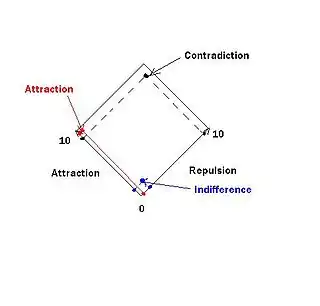 Unlike traditional question formats, especially the semantic differential format where the respondent must choose a point on a one-dimensional scale anchored by two semantically opposite terms, the diamond of opposites allows the respondent to express attraction and repulsion independently. In this format, the stem describes an object, person or situation in relation to which the respondent is asked to indicate their degree of attraction and repulsion. The two variables are plotted on two orthogonal axes.