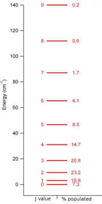By fitting all observed bands, the rotational constants for N2H+ were determined to be Be = 1.561928 cm−1 and De = 2.746×10−6 cm−1, which are the only constants needed to determine the rotational spectrum of this linear molecule in the ground vibrational state, with the exception of determining hyperfine splitting. Given the selection rule ΔJ = ±1, the calculated rotational energy levels, along with their percent population at 30 kelvins, can be plotted. The frequencies of the peaks predicted by this method differ from those observed in the laboratory by at most 700 kHz.