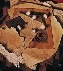 His meticulously composed and rendered still lifes feature favorite objects such as bottles, an empty bowl, eggs, and musical instruments. Ket juxtaposed these objects in angular arrangements, seen from a high vantage point, their cast shadows creating emphatic diagonals. These compositions reveal the influence of cubism as filtered through the posters of Cassandre, which are frequently depicted in Ket’s paintings. Another source of inspiration came from early Netherlandish painting, which Ket admired for its atmosphere of austere reverence that he called its quality of "intrusiveness".[1]