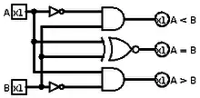 One-bit binary full comparator, equality, inequality, greater than, less than at gate level. Created using CircuitLab