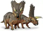 Thomas M. Lehman, in a study of Late Cretaceous dinosaur distribution, concluded that they were "remarkably provincial," with herbivorous dinosaurs exhibiting "persistent latitudinal and altitudinal zonation" in "[d]istinctive endemic associations."[1] Provincialism was even present during the turbulent faunal turnover of the Maastrichtian stage, when the Laramide Orogeny triggered "the most dramatic event that affected Late Cretaceous dinosaur communities in North America prior to their extinction."[1] This turnover event saw specialized and highly ornamented centrosaurines and lambeosaurines be replaced by more primitive upland dinosaurs in the south while northern biomes became dominated by Triceratops with a greatly reduced hadrosaur community.[2]